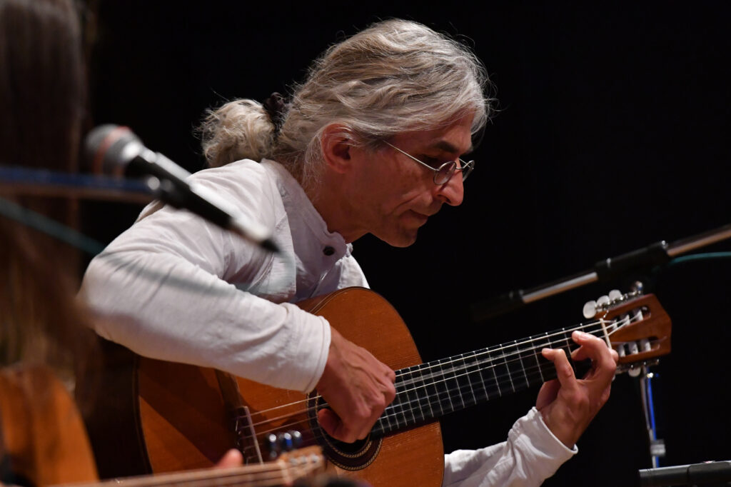 Michael Pfleger bevorzugt die klassische Nylonsaiten-Gitarre, deren vielfältige Möglichkeiten von Zupf- und Schlagtechniken, von Tapping und Perkussion er immer wieder neu auslotet.